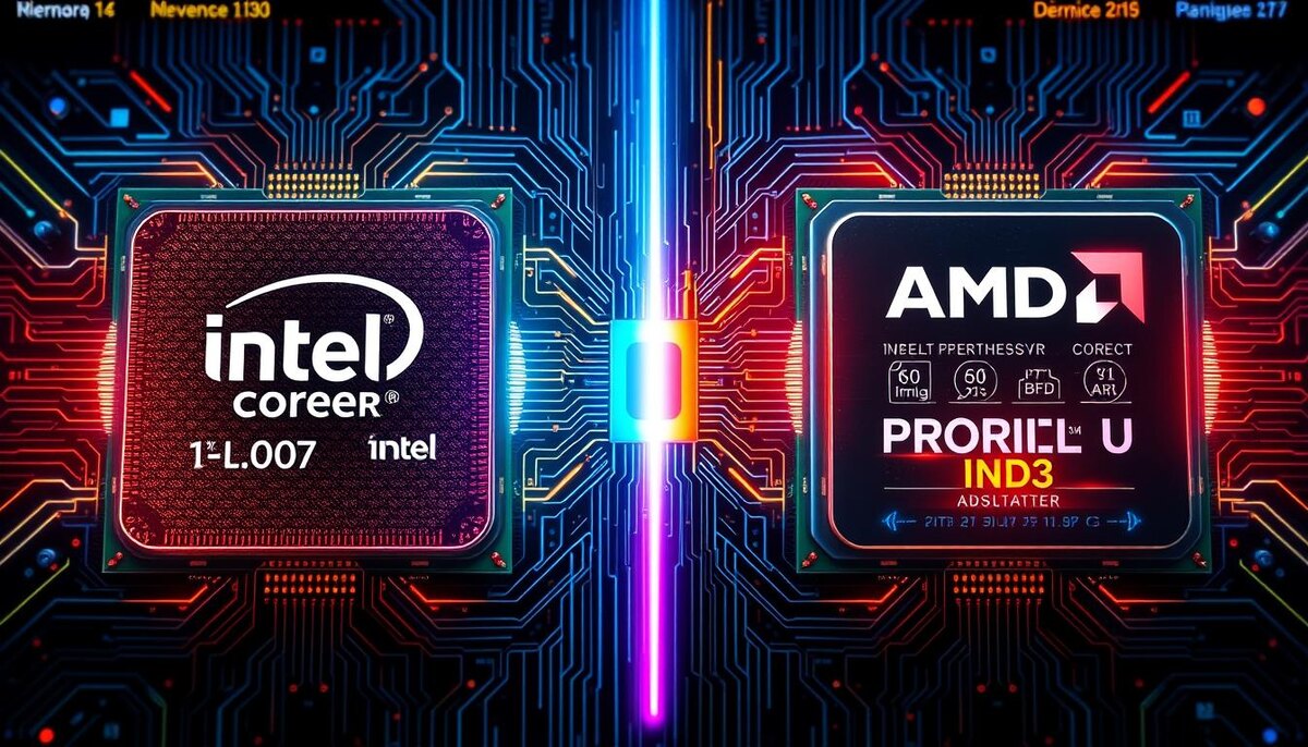 Динамичная сцена сравнения, демонстрирующая процессор Intel с одной стороны и процессор AMD с другой. Каждый процессор представлен в деталях, в окружении яркой графики, отображающей показатели производительности, тепловыделение и различия в архитектуре. На заднем плане изображена высокотехнологичная цифровая среда, включающая схемы печатных плат и светящиеся потоки данных, что подчёркивает передовые технологии обоих брендов.