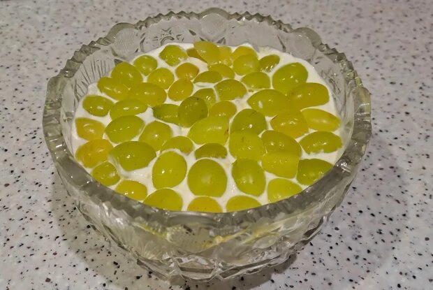Ингредиенты Филе куриной грудки 300 г Твердый сыр 70 г Куриное яйцо 3 штуки Белый виноград 150 г Грецкие орехи 100 г Майонез 100 г 1.Подготовить необходимые ингредиенты. 2.Куриную грудку отварить в соленой воде, остудить в бульоне. Нарезать кубиком среднего размера или соломкой. 3.Куриные яйца отварить, остудить, очистить. 4.Грецкие орехи при необходимости очистить от скорлупы, хорошо помыть, немного подсушить на сковороде. 5.Грецкие орехи измельчить. 6.Виноград хорошо вымыть, отделить от ветки. Разрезать каждую ягоду пополам. 7.Твердый сыр натереть на мелкой терке. 8.Для формовки салата подойдет глубокий салатник. На дно выложить нарезанную куриную грудку, немного утрамбовать ложкой, смазать майонезом. 9.На куриную грудку выложить дробленый грецкий орех. 10.На орехи выложить натертый сыр, слегка утрамбовать ложкой. 11.Куриные яйца натереть на мелкой терке. 12.Выложить следующим слоем в салатник натертые куриные яйца, смазать майонезом. 13.Выложить верхним слоем в салатник подготовлен