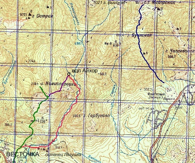 Можно даже поднявшись по тропе на гору Майорскую, как показано синим цветом - и с неё бездорожьем свалить в бассейн Комиссаровки, на обратном пути пройдя мимо Айхора, а если хватит сил и времени, то и его посетить. Но это - отдельная история.