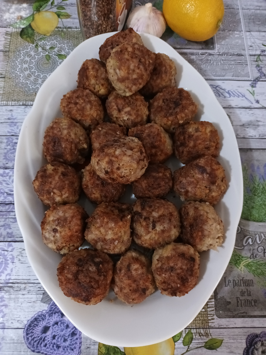 В нашей семье готовят два вида тефтелей. От разных бабушек пришли рецепты. Эти от бабушки Тани - Гулаевой Татьяны Степановны. Их очень уважает её внук - мой муж. Для него и старалась. Любой фарш, отварной рис, луковицу натереть на тёрке, яйцо, чёрный перец, соль. Накрутить шариков, панировать в муке и обжарить на сковороде, на медленном огне. Она жарила на смальце, мы на растительном масле. От себя я в фарш добавляю пару зубчиков чеснока. Тефтельки получаются вкусные, с хрустящей корочкой. Рецепт этот был у бабы в ходу. С каких пор не знаю. Готовили так на Украине откуда она была родом или в войну она научилась, когда кухарила в офицерской столовой про то неведомо мне. Моя бабушка Саша - Воронкова Александра Ивановна тоже готовила тефтели. Всё также (чуть покрупнее), но не обжаривая, складывала в кастрюлю, добавляла зажарку (лук, морковь, томат), аккуратно наливала по краю воды и тушила на медленном огне.