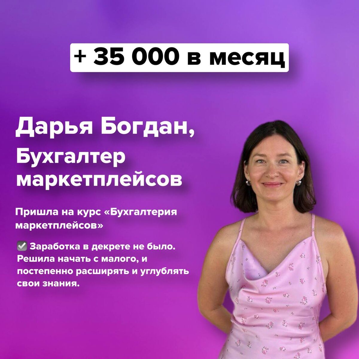 💰Зарабатывать удаленно можно! Сегодня хочу вас познакомить с Дарьей Богдан - выпускницей курса «Бухгалтерия маркетплейсов». Дарья - мама в декрете. Заработка не было и она решила начать с малого и постепенно расширять и углублять свои знания. После обучения ее доход составил +35 000₽ ежемесячно 👏 Курс помог ей стать увереннее, зарабатывать деньги на своих знаниях! Своих клиентов Дарья нашла через Телеграм и Авито🔥 В планах у Дарьи увеличить свой доход в 2 раза!