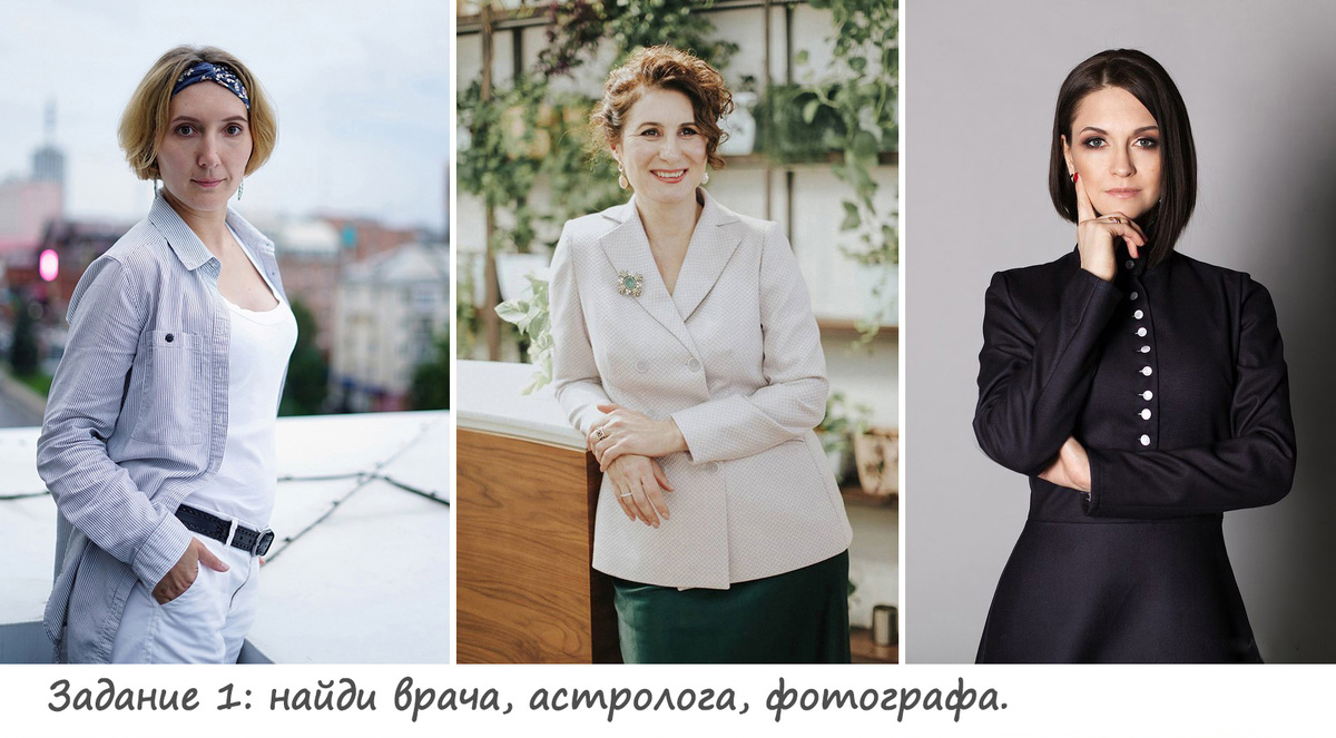Я понимаю, кто я. А насколько важно, чтобы другие люди быстро это понимали? Возможные клиенты, потенциальные друзья, противоположный пол? Классно, когда люди сразу тянутся к вам общаться и покупать ваши услуги, потому что чувствуют душевное родство или близкие им качества. А как такое вообще происходит? 🧩 Дело в том, что по внешности мы можем ОЧЕНЬ быстро построить предположения о человеке. Мы еще не узнали о нем ничего. Но по внешности уже составили мнение. По сути - сочинили о нем историю. В современных реалиях быстрота понимания часто имеет решающее значение, подолгу вглядываться некогда, и люди склонны выбирать то, что сразу понятно. Специально заморочилась и нашла для вас живой пример. На фото - реальные врач, астролог, фотограф. Попробуйте определить, кто есть кто. Думаю, у вас это быстро получилось 😊 А теперь попробуйте то же самое проделать со вторым рядом фото. Это те же люди, что в первом ряду. Вы видите красивых женщин, но вряд ли сможете по этим "парадно-выходным" фото п