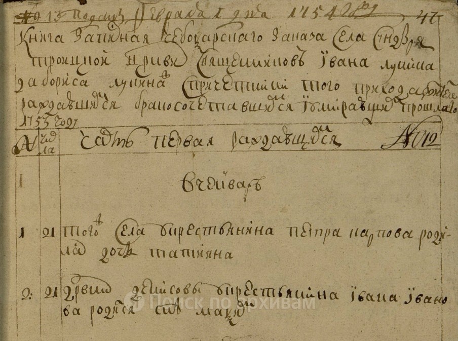 Государственный архив Чувашской Республики. Фонд № 225, опись № 3, дело № 24. Стр. 60-66 скан. Подана февраля 1 дня 1754 году. Книга записная Чебоксарского заказа села Сундыря Троицкой церкви священника Ивана Лукина да Бориса Лукина ж с причетники того прихода жителей рождавшихся бракосочетавшихся и умиравших прошлого 1753 году. Часть первая. О рождавшихся. В генваре. 1. 21 числа. Того ж села у крестьянина Петра Карпова родилась дочь Татьяна. 2. 21 числа. Деревни Денисовы у крестьянина Ивана Иванова родился сын Максим. В феврале. 3. 21 числа. Деревни Ворошиловы у крестьянина Степана Яковлева родился сын Тимофей. В марте 4. 17 числа. Деревни Ворошиловы у крестьянина Василия Иванова родился сын Алексей. В апреле 5. 14 числа. Того ж села у крестьянина Афонасия Онисимова родился сын Симион. В мае 6. 13 числа. Деревни Моляковы у крестьянина Василия Карпова родилась дочь Гликерия. В июне 7. 13 числа. Того ж села у крестьянина Гаврилы Варламова родилась дочь Агрепина. В июле 8. 8 числа. Дере