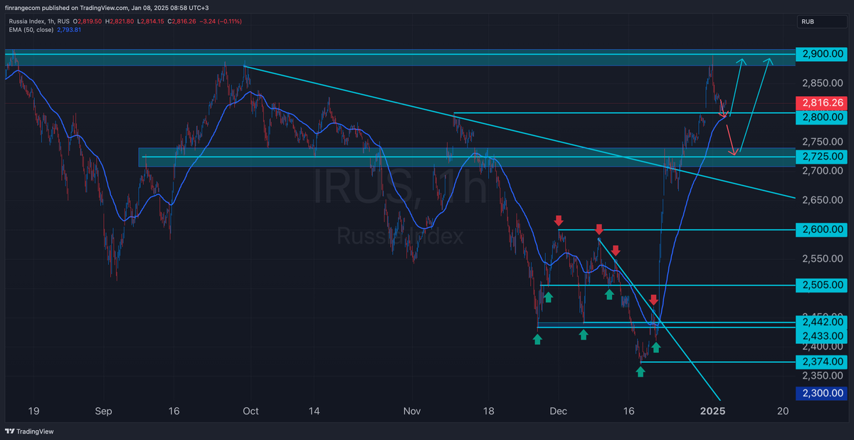 Данный обзор – это моё субъективное виденье рынка, на которое я ставлю свои деньги исходя из моего риск- и мани- менеджмента. Рынок в моменте В понедельник всё-таки удержали уровень поддержки 2800 пунктов по индексу МосБиржи. Поэтому пока буду работать от лонга, но не строить иллюзий. Тем не менее, если участники рынка расценят завершение конфликта в течение 6 месяцев, как негатив, то можем и вниз пойти сегодня… в любом случае, звучит, как бред… потому что гарантий по срока никто дать не может, но многие ждали конца января 😅 Ближайшее время рынок будет в боковике 2800 – 2900 пунктов. Главное, чтобы весь год в нём не прожили. Сегодня поддержку рынку будут оказывать цены на нефть, которые вышли из торгового диапозона 71-76 долларов за баррель. В России официальные дни заканчиваются 8 января. Поэтому эта неделя короткая, профучастники рынка начнут возвращаться 9-10 января. Большинство скорее всего начнут активно торговать уже с 13 января. В связи с этим, не спишите открывать сделки и дел