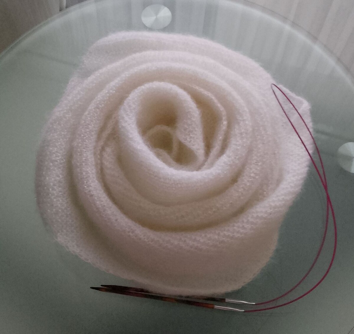 Главное событие - уже в ночи, на стыке двух дней, я довязала косынку- горлогрейку! 🥳 Как-то незаметно это случилось, на одном дыхании, что называется. Не было цели довязывать, хотелось бездумно поперебирать петельки. Рядок за рядком, вот уже и петли закрывать нужно. Решила не откладывать на завтра. Напрочь забыла, что в косынке Серень делала это крючком. Сижу себе, закрываю спицами, почти четверть петель закрыла, довольная. Глядь на закрытую часть, а там фалды, морская волна. 😯 Делать нечего, надо распускать. Мохер! Распускать! А закрытие ещё и с накидами. Не знаю, сколько времени я колупала, но сделала-таки дело. Закрыла по такому же принципу, с накидами, но крючком и номер взяла меньший, чем спицы, 2,5. Получился ровный, эластичный, аккуратный край. Такой результат меня удовлетворил. 🤗 Итак, 50г мохера на шёлке, деревянные спицы номер 3,25, крючок номер 2,5, некоторое количество времени, умение вязать лицевые петли и вот она, готовая работа: косынка Лана. Уже по окончани