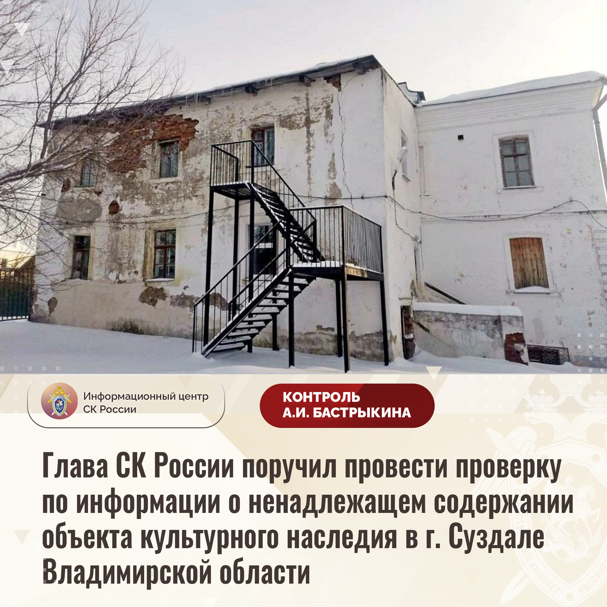 Глава СК России поручил провести проверку по информации о ненадлежащем содержании объекта культурного наследия в г. Суздале