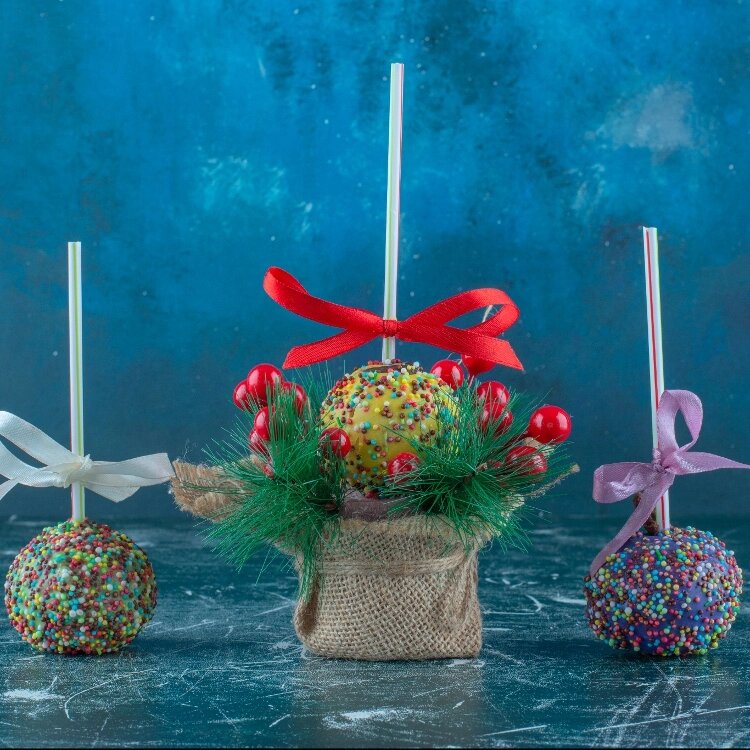 Убери у яблок плодоножки и хвостики. Затем вставь шпажку в каждое яблоко вращательными движениями примерно до середины плода. Заранее подготовь посыпку и измельчи орехи. В сотейнике смешай сахар с водой, поставь на огонь и постоянно помешивай. Как только сироп закипит, добавь уксус и продолжай варить до температуры 150 градусов. Когда нужная температура будет достигнута, сними сотейник с огня и проверь готовность карамели, капнув немного сиропа в холодную воду – он должен затвердеть в форме шарика. В горячую карамель добавь ароматизатор и пищевой краситель, тщательно перемешай. Окуни яблоко в карамель и сразу погрузи его в подготовленную посыпку или орехи. Оставь яблоки остывать при комнатной температуре около 30 минут.