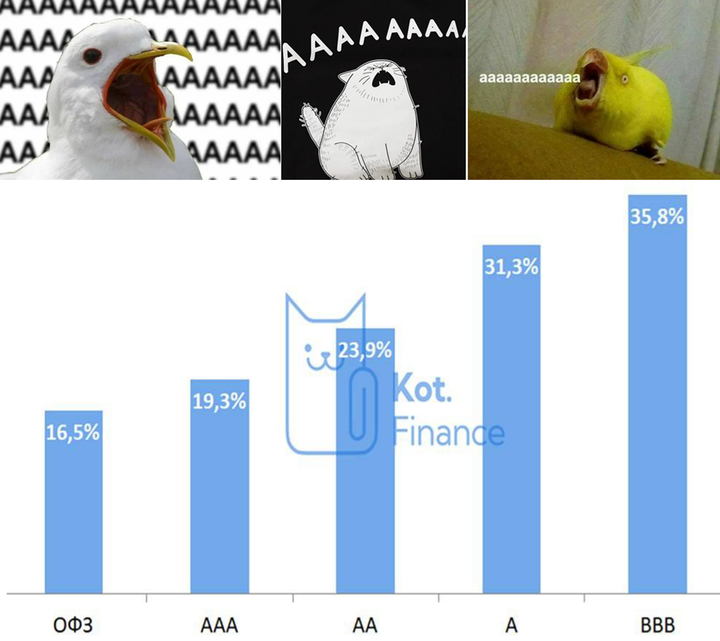 Мы присмотрелись, какую доходностью дают облигации ААА: 16,5% ОФЗ (-4,5% от ключевой ставки) и 19,3% в высшем кредитном рейтинге корпоративных облигаций (-1,7% от ключевой)… Это же Аааааааааа 👉классные подборки облигаций 👉краткие итоги года в облигациях 👉ТОП и антитоп в акциях --- 🐾Кот.Финанс