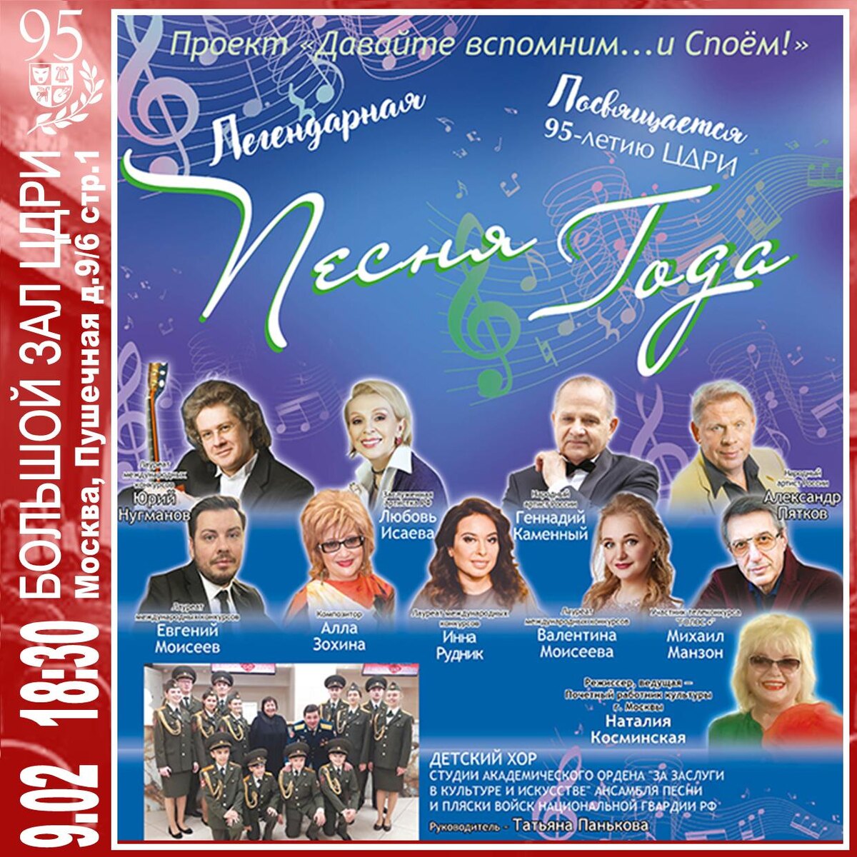 Валентина Моисеева участник телевизионного вокального конкурса «Голос+» — Михаил Манзон композитор — Алла Зохина Все они вместе со зрителями вспомнят и споют главные песни нашего любимого фестиваля. Украшением концерта будет Детский хор Академического ансамбля песни и пляски войск национальной гвардии РФ под руководством Татьяны Паньковой, бывшей солистки Детского хора радио и ТВ, неоднократно выступавшем в «Песне года». Режиссер и вед