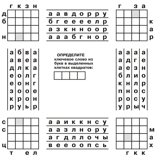 Буквы горизонтальных слов из пар квадратов как бы смешались и расположились в алфавитном порядке в соответствующих рядах между квадратами. А буквы вертикальных слов - в столбцах. Восстановите слова в квадратах. ОТВЕТ: