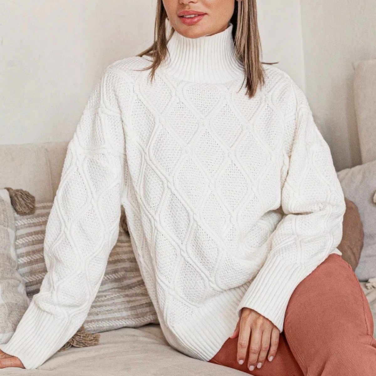 Я уже показывала вам этот свитер в лиловом цвете, но именно в белом данная модель смотрится особенно шикарно! Белоснежный свитер с высоким горлом и классическим узором из рельефных ромбов с рисовой путанкой. Элегантно, стильно и, главное, тепло! Хотя оригинальный вариант не слишком тёплый (60% хлопок, 40% акрил), но мы можем взять пряжу потеплее... или связать с таким составом для будущей весны.