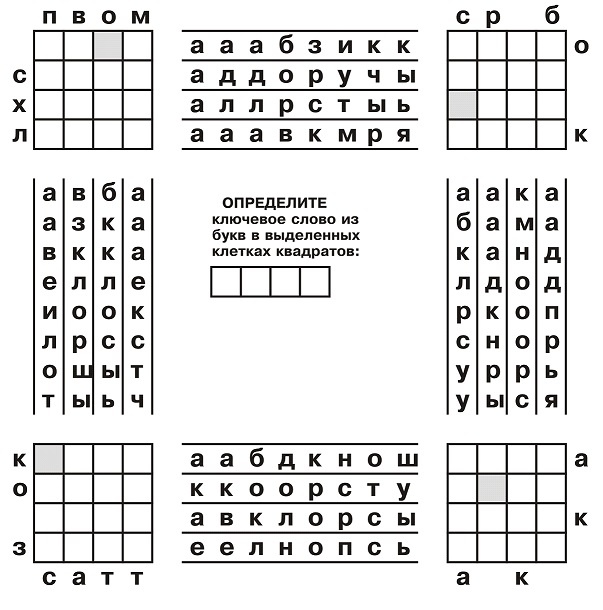 Буквы горизонтальных слов из пар квадратов как бы смешались и расположились в алфавитном порядке в соответствующих рядах между квадратами. А буквы вертикальных слов - в столбцах. Восстановите слова в квадратах. ОТВЕТ: