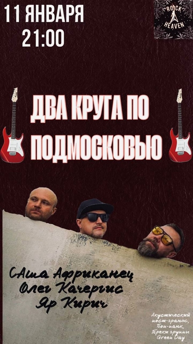 Саша Африканец, Олег Качергис и Яр Кирич едут в тур «Два Круга по Подмосковью» со своим авторским материалом и избранными кавер-версиями известных песен. Яр Кирич - гитара, вокал. Солист группы «Гараж». Африканец - гитара, вокал. Лидер группы «Сны Африканца». Олег Качергис - гитара, перкуссия, вокал. Проект «Вайнона» 🗓 11 января, СУББОТА ⏰ Начало в 21:00 📍Королев, пр-т Королева 9 | Rock Heaven Bar ▪Бронь столов по ссылке ссылке 👉🏻 vk.cc/cqozeo или по телефону +7 (915) 030-80-11