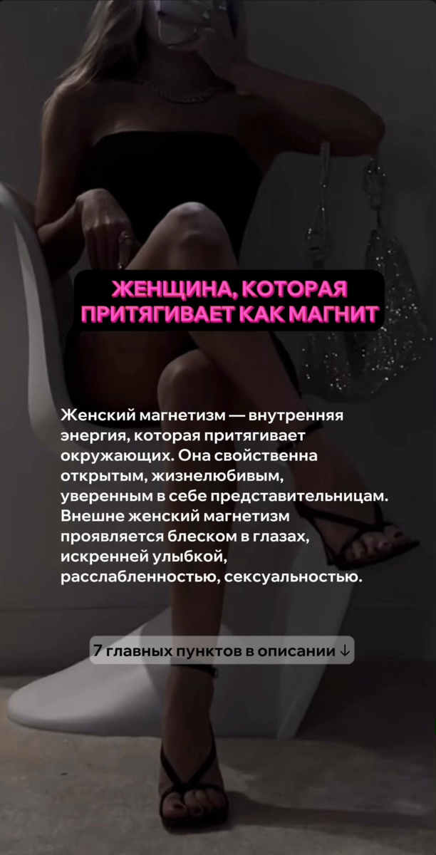 Сохраняй и отправляй подруге, которой желаешь добра🙌🏻👇 * Независимая личность. Женщина самостоятельна в принятии решений. У нее есть свое мнение, и она не стесняется его высказывать. Такой женщине нет необходимости подстраиваться под других, так как у нее отсутствует потребность в чужом одобрении и отметке. Прежде всего она уважает себя и свои чувства. Ее желания – на первом месте. Такая женщина, как правило, довольна собой и своей жизнью. * Инициатива. Мужчинам нравятся женщины, которые не боятся проявлять инициативу. Постарайтесь вызвать интерес к себе, обратить на себя внимание и он сам захочет проявлять активность. Все, что нужно — это легкая улыбка, просьба о помощи или вовремя сказанный комплимент. * Позитивная энергия. Оптимизм и жизнерадостность создают вокруг неё атмосферу, в которую люди хотят возвращаться. Она довольна своей жизнью, живет в согласии с собой. Мужчины легко считывают внутреннее состояние женщины. *Обояние — это нечто большее, чем внешность. Это умен