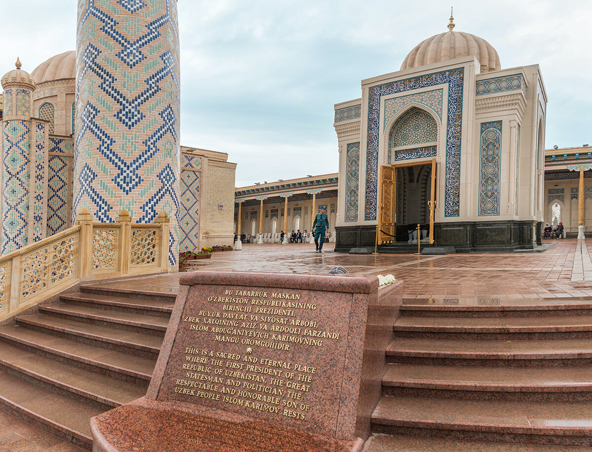 «Это священное место является вечным пристанищем Первого Президента Республики Узбекистан, великого государственного и политического деятеля, дорогого и любимого сына узбекского народа Ислама Абдуганиевича Каримова»- гласит надпись на мраморной плите у входа в мавзолей, выбитая на английском и узбекском языках. Этот мавзолей совсем не древность и был построен в 2018 г. Здесь похоронен первый Президент Узбекистана Ислам Каримов, который 26 лет правил Узбекистаном, вплоть до своей смерти в сентябре 2016 года. Здание высотой почти 8 метров возвели над могилой Ислама Каримова, надгробие которой сделано из белого оникса. Стены усыпальницы украшены драгоценными камнями и позолотой, а нижняя часть облицована зеленым ониксом. Место для могилы и мавзолея Каримова было выбрано не случайно. Похоронен он на территории мечети Хазрат-Хызр. Кто такой Хазрат-Хызр? Какая история у мечети,названной в его честь? Это место было намолено еще во времена,когда здесь располагался зороастрийский храм. Рядом н