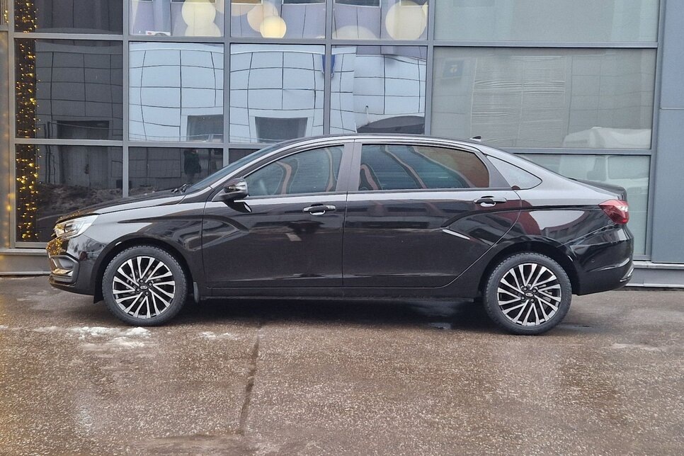 Спереди — почти Веста в топовой комплектации, только в непривычно темном исполнении с кожаными креслами и антрацитовыми декоративными планками вместо серебристо-серых или оранжевых