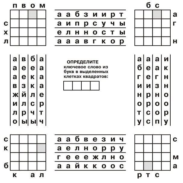 Буквы горизонтальных слов из пар квадратов как бы смешались и расположились в алфавитном порядке в соответствующих рядах между квадратами. А буквы вертикальных слов - в столбцах. Восстановите слова в квадратах. ОТВЕТ: