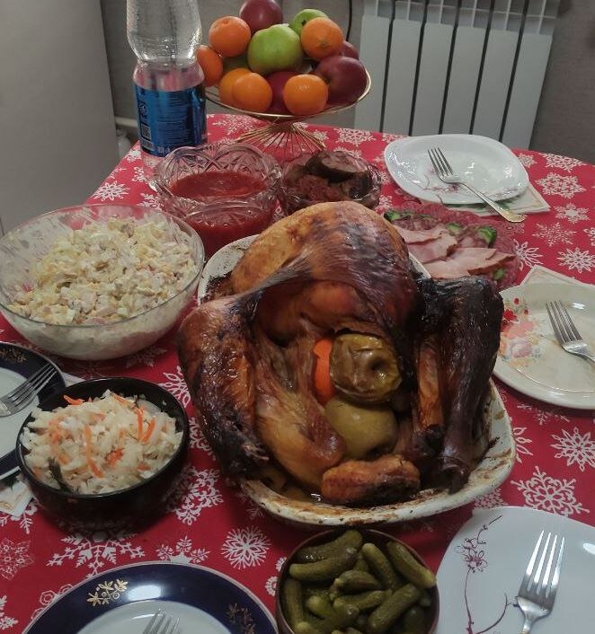 Внезапно, перед новым годом, мы с мужем вдруг осознали, что ни разу не готовили индюшку целиком. А тут еще на базаре попались вполне приличные тушки, еще и местного производителя.