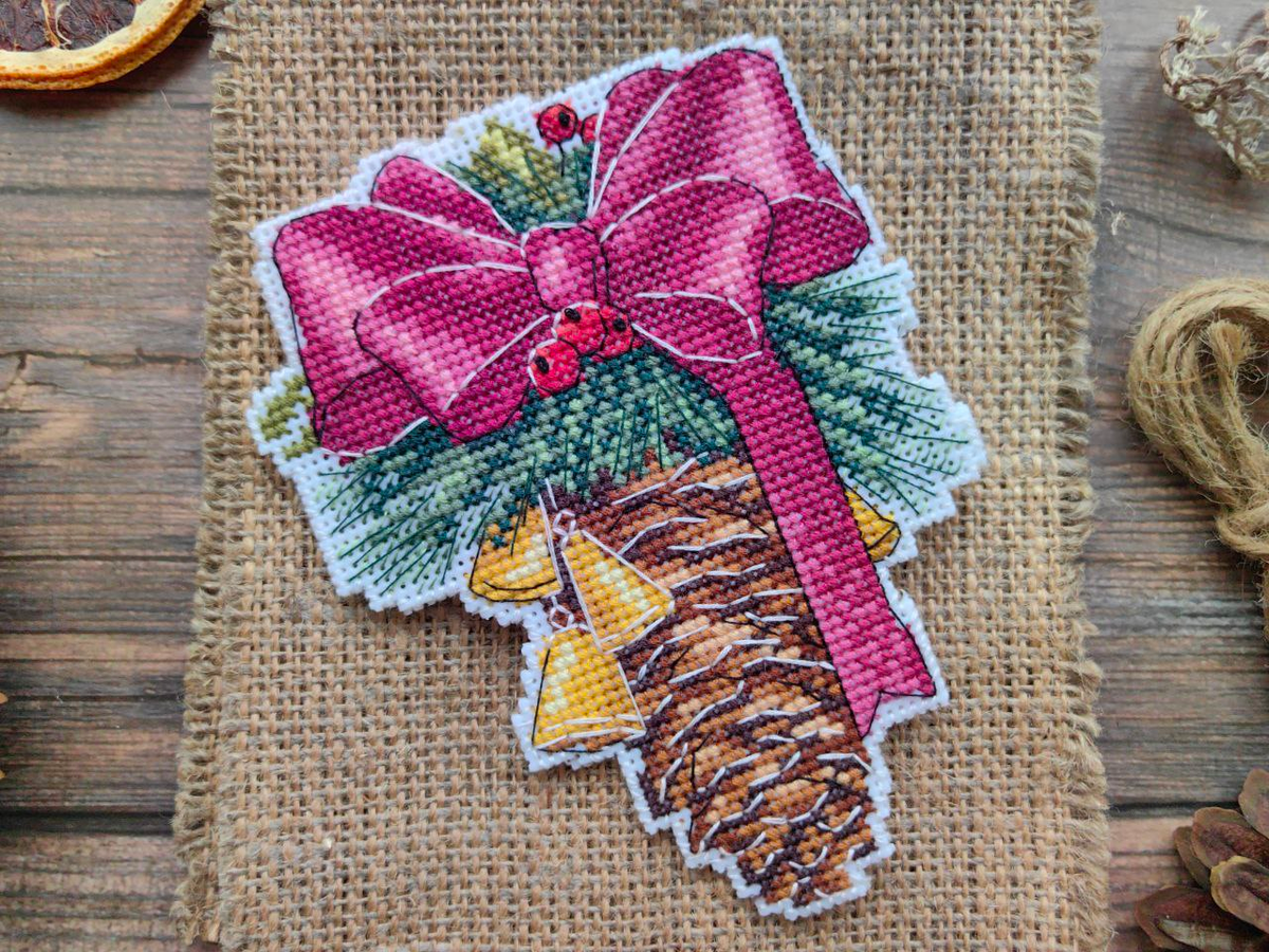И это не работа "Натюрморт. Венеция." В декабре я приняла участие в игре "Тайные Снегурочки", которую организовала Лена (канал Затворница). Если кратко, то смысл игры в том, что ты кому-то отправляешь подарок и тебе кто-то отправляет тоже. Самое интересное, что ты не знаешь кто именно тебе отправит, личность отправителя засекречена. В чате вотсапа мы обменялись ответами на небольшой список вопросов касаемо возможных хотелок и антихотелок. В своей анкете я написала, что буду раза любому сюрпризу, но мне было бы интересно вышить что-то на пластике. Раньше я ни разу не вышивала на чем-то другом, кроме канвы. И вот в подарок мне пришел чудесный наборчик. Я отложила текущий процесс и приступила к шишке. Я понимала, что до Нового года не успею ее оформить и конечно же не успела. Ну ладно, успела по датам к старому Новому году, так что считается. Мне она очень нравится. Такая яркая, нарядная. Единственно, уже сшив вместе детали, я увидела, что забыла сделать на одной половинке фрузелки на я