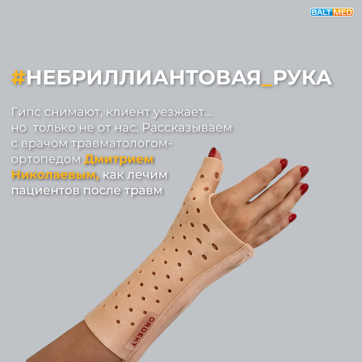🫣Упал, очнулся, гипс ❄Зима — один из самых травмоопасных сезонов, и мы готовы помочь вам в случае необходимости. 🩺Если вы упали и получили травму, наши врачи-травматологи в клинике «Балтмед» готовы восстановить вас максимально быстро и эффективно. Что мы используем в «Балтмед»? Мы применяем современные ортезы из термопластика, которые стали отличной заменой обычному гипсу. Они обладают множеством преимуществ: ✅ Короткий срок реабилитации. Ортезы плотно прилегают к конечности, что увеличивает подвижность, поддерживает мышцы в тонусе, улучшает кровоток и питание тканей, тем самым ускоряя заживление. ✅ Малый вес и высокая прочность. Термопластик обладает особой структурой, обеспечивающей его надежность и легкость. Это позволяет вам двигаться с комфортом без лишнего напряжения. ✅Влагостойкость. С ортезами вы можете принимать душ, плавать в бассейне и отдыхать на пляже, не меняя привычный образ жизни. ✅ Дышащий материал. Отличная вентиляция исключает возможность появления зуда и аллергиче