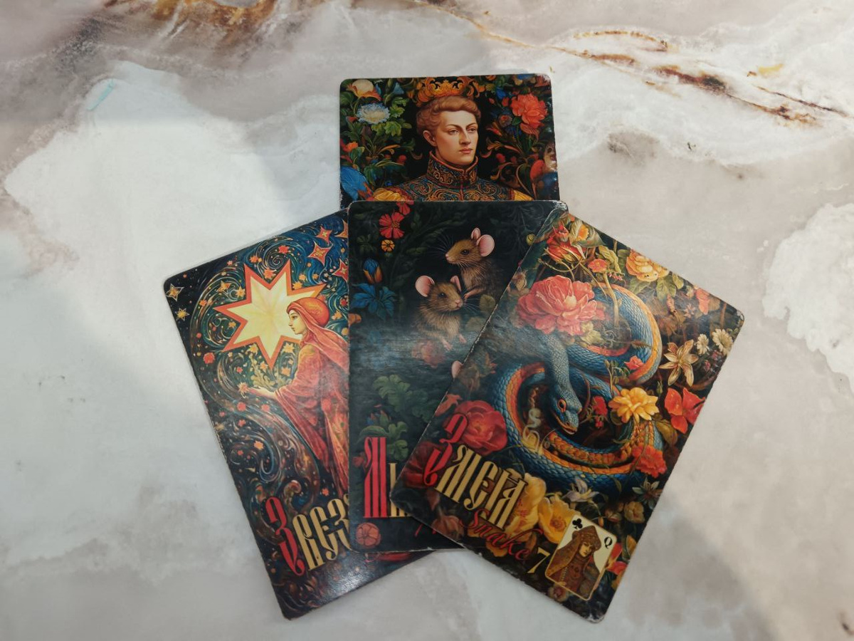 Перед нами расклад, полный символизма, интриг и неожиданных намёков. Давайте взглянем на эти три карты — Звезда, Мышь и Змея — и разберём, что они рассказывают о вашем партнёре и его намерениях.
