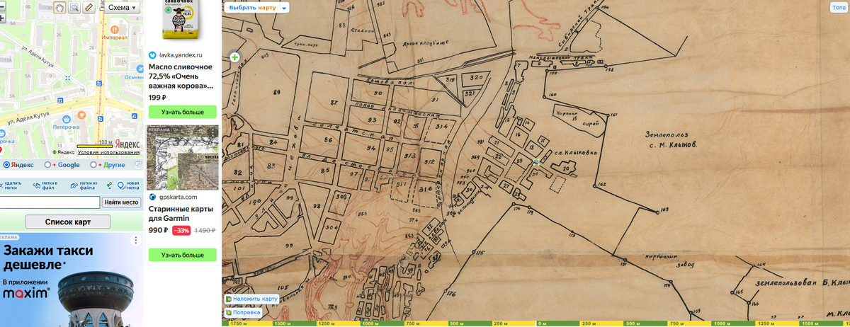 Ну а в 1943 Кзыл-Армейская пробилась через огороды к лугам, зато глазами можно разглядеть, что же рисовали как улицу в 1930. Это неимоверно узкий переулок! Не зная, что он есть и не разглядеть.