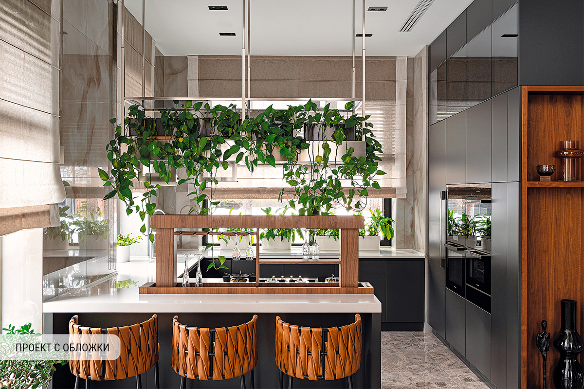 Дизайнер Оксана Шейх создала интерьер дома, который гармонирует с его архитектурой и окружающим ландшафтом. Так был выдержан идеальный баланс между созданным человеком и природой, который порождает место, откуда не хочется уезжать. Перед нами стояла задача сделать дизайн дома долговременным, поэтому и проектировочные решения были выбраны стандартные, но вечные: большая кухня-гостиная, объединяющая всех членов семьи в одном пространстве, родительский мастер-блок с гардеробными и детская с отдельным санузлом. После реализации дома мы создали беседку, сгруппировав постройки вокруг нее таким образом, чтобы сформировать внутренний двор. Так на участке появилось приватное пространство, закрытое от соседей. Ключевая концепция архитектурного решения предопределила использование в интерьере большого количества деревянных текстур и мебели. Мой любимый элемент проекта — это летняя кухня с лаундж-зоной для проведения уютных вечеров, полностью обшитая тиком. Натуральные материалы фасада дома объеди