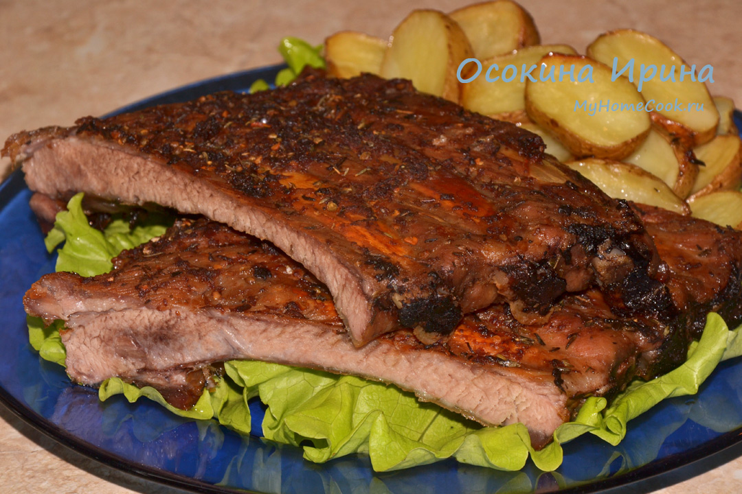 Супруг очень неравнодушен с мясу на кости, особенно любит рёбрышки. Поэтому периодически стараюсь его радовать. Сегодня так: для маринада в миске смешала 1/2 стакана растительного масла, 1/3 стакана красного винного уксуса, по 1 ч.л. сушеных орегано и тимьяна, хорошую щепоть чили, соль и перец по вкусу и 5 измельчённых зубчиков чеснока, подвзбила, густо обмазала этой смесью большую ленту (на 700 г) зачищенных свиных рёбер и оставила на час подмариноваться, затем переложила рёбра в форму той стороной, где была кожа, накрыла форму крышкой и запекла в духовке, разогретой до 180 градусов, в течение 30 мнут, затем достала форму, перевернула рёбра и обмазала остатками маринада. Около 0,5 кг мелкого картофеля хорошенько промыла, порезала пополам, посолила, сбрызнула растительным маслом, промешала и обложила пластину рёбер в форме, снова накрыла форму крышкой и вернула духовку ещё на 30 минут, затем сняла с форму крышку, убавила температуру в духовке до 150 градусов и продолжила запекать всё е
