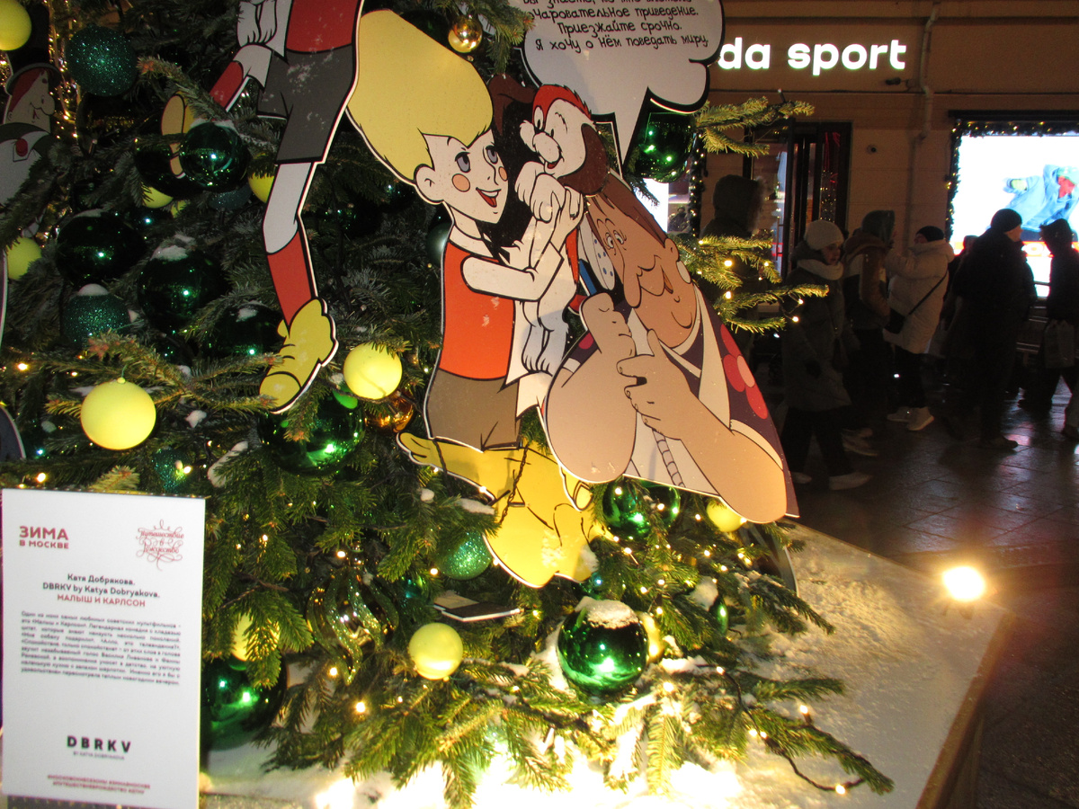 Но в этом сезоне дизайнеры выбрали для украшения ёлок, пожалуй, самую выигрышную тему "Любимые фильмы детства", и угодили всем москвичам. Самой большой популярностью на Кузнецком Мосту пользовалась ёлка, украшенная по мотивам мультфильма "Малыш и Карлсон". Фрагменты одной из версий этого мультика крутили по вечерам во время новогодних праздников, проецируя изображение на верхнюю часть бокового фасада реставрируемого Пассажа Попова - дома № 12 на Кузнецком Мосту. На вечерних показах фестиваля "Город света", как и положено Карлсону, он "появлялся" на крыше дома, шалил,: открывал подарки, разливал варенье, летал, треща пропеллером, и веселил прохожих.