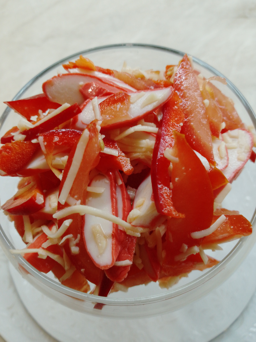 Простой, быстрый в приготовлении, но в тоже время яркий, красивый и вкусный салат. Нам понадобится: Крабовые палочки, Помидор Красный болгарский перец Сыр Чеснок Майонез Соль, перец по вкусу и желанию. Крабовые палочки нарезаем кусочками слегка наискосок. Сладкий перец и помидор нарезаем брусочками. Если помидор очень сочный то семенную коробку лучше убрать. Сыр трем на мелкой тёрке. Все хорошо перемешиваем. В майонез добавляем не много натертого на мелкой тёрке или перетертого с солью чеснока. Заправляем салат. По желанию можно украсить зеленью. Приятного аппетита!
