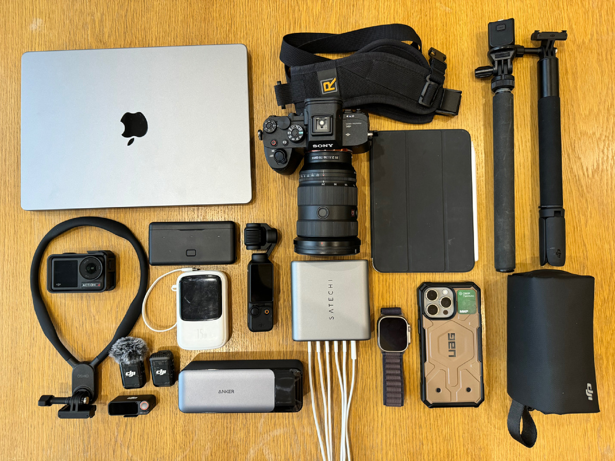 Вот мой набор техники, который я возьму в горы, где по часовой стрелке слева направо мы имеем: Macbook Pro 16 дюймов, камеру Sony A9 с плечевым ремнем Black Rapid, iPad Mini 6 со стилусом, два монопода, один для Osmo Pocket 3, другой для Osmo Action 4, чехол микрофонов, iPhone 15 Pro Max в бронебойном чехле Ваг, часы Apple Watch Ultra 2, многопортовое з/у на 140W Satechi, повербанк Anker, камера Osmo Pocket 3, повербанк Baseus, набор беспроводных микрофонов DJI Mic 2, шейное крепление для камеры Osmo Action 4 и, собственно, сама камера.