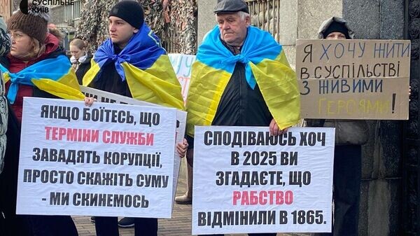Родственники украинских военнослужащих вышли на митинг к Генштабу ВСУ с требованием о демобилизации для тех, кто находится на фронте с 2022 года Надписи на плакатах: "Я хочу жить в обществе с живыми героями" (отсылка к лозунгу "герои не умирают"); "Если боитесь, что сроки службы помешают коррупции, просто скажите сумму – мы скинемся"; "Надеюсь, хоть в 2025 году вы вспомните, что рабство отменили в 1865" (имеется в виду, почему-то, отмена рабства в США. Крепостное право на украинских землях, входивших в состав Российской империи, было отменено в 1861, а в состав Австро-Венгерской империи – в 1848). К протестующим вышел представитель Генштаба ВСУ Станислав Бойчук. Он заявил, что закона о демобилизации не будет – на фронте не хватает людей. "Это билет в один конец. Люди выжаты физически, морально, и просто не вытягивают, поэтому такое большое количество СОЧ (самовольное оставление части – Ред.) происходит. За три года чиновникам стоило бы уже подготовить замену бойцам, которые на фронте с