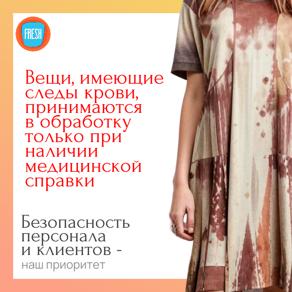 Уважаемые клиенты, мы ценим ваше доверие и стремимся обеспечить вам качественный сервис. В то же время, наша главная задача – это забота о безопасности наших сотрудников и всех клиентов. В связи с этим, мы вынуждены напомнить правила приема вещей, загрязненных кровью. Почему мы требуем медицинскую справку? Мы понимаем, что это может вызвать некоторые неудобства, но хотим объяснить, почему это требование является необходимым: 1. Риск инфицирования: Кровь, даже в небольших количествах, может быть источником опасных патогенных микроорганизмов, включая вирусы ВИЧ, гепатита B и C, а также других инфекций. Эти заболевания представляют серьезную угрозу для здоровья наших сотрудников и других клиентов, которые могут контактировать с загрязненными вещами. 2. Соблюдение санитарных норм: Работа с биологическими жидкостями, такими как кровь, требует строгого соблюдения санитарных правил и норм. Мы обязаны использовать специальные методы дезинфекции и утилизации отходов, чтобы предотвратить р