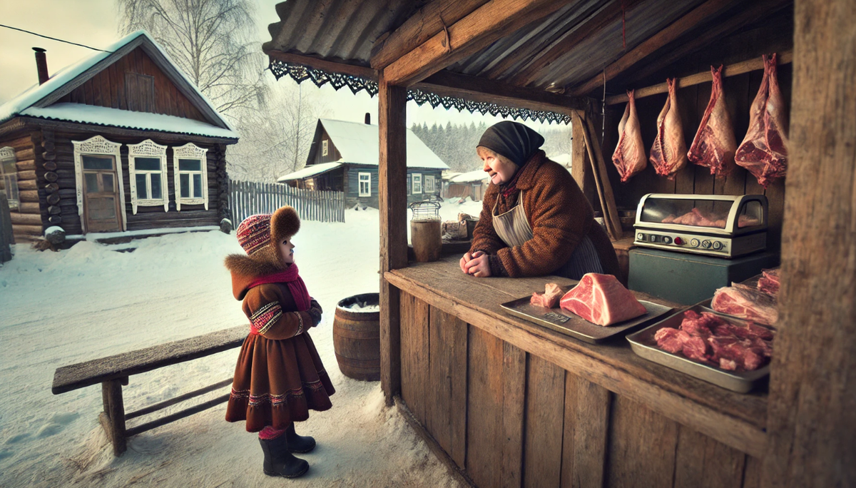 Было раннее утро, когда бабушка в своём неизменном шерстяном платке вошла в мясную лавку. В руках у неё был узелок, завернутый в чистую белую ткань. Наталья стояла за прилавком, раскладывая свежие куски мяса, и сразу заметила её.
