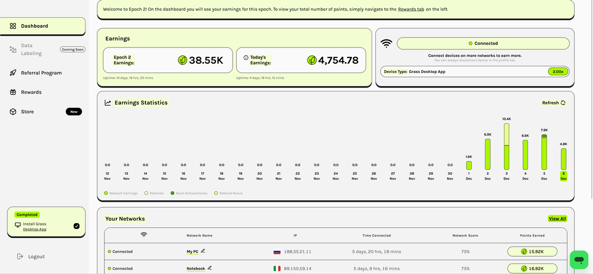 Один из самых известных DePIN проектов в 2024 году. Уже раздал довольно много за первые сезоны и собирается раздать ещё за последующие. Кроме браузерной ноды под Chrome, есть также отдельно устанавливаемое приложение, которое позволяет увеличить доход с ноды в 2 раза, но очень требовательно к сети.