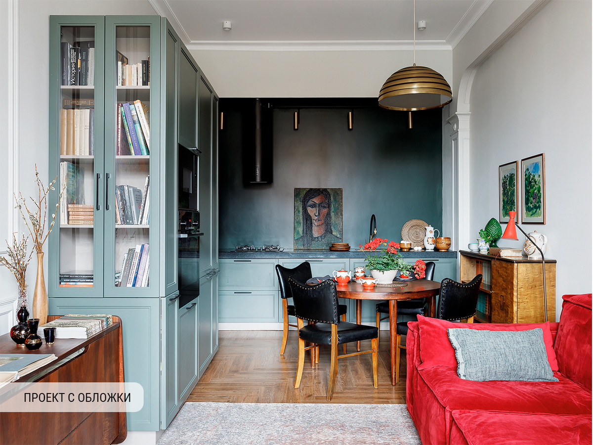 Дизайнер Анюта Король создала гармоничный интерьер для своей семьи в старом фонде Санкт- Петербурга. Когда-то это была роскошная квартира в доходном доме конца 19 века, затем советская коммуналка, теперь — современное пространство, наполненное винтажной мебелью. Дизайн-проект квартиры действительно уникален и отражает нашу с дочкой индивидуальность. Интерьер получился яркий и разнообразный по цвету, при этом в нем сочетаются разные стили и эпохи. В основе лежит неоклассика, но в тоже время интерьер наполнен современными и винтажными предметами. Каждая из нас определила для себя акцентные цвета. Основной светло-серый цвет интерьера, напоминающий небо Санкт-Петербурга, служит отличной базой для ярких акцентов, таких как болотно зеленый, бруснично-красный, приглушенный синий, лиловый и насыщенно-бирюзовый. Картина, приобретенная на блошином рынке, стала вдохновением для создания цветовой гаммы всего интерьера. Болот- но-зеленый цвет, который мы выбрали для кухни, ванной комнаты и прихожей