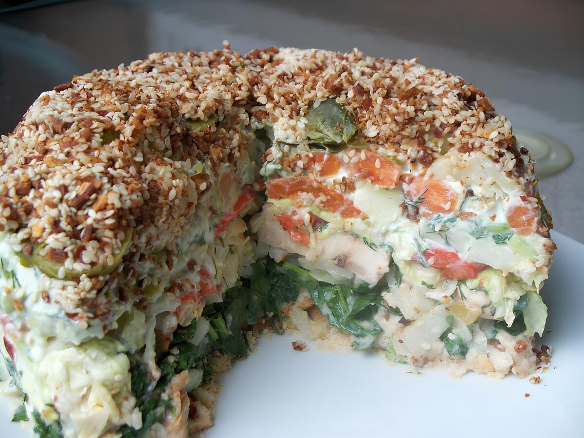 Ингредиенты для соуса №1: для соуса №2: 1 слой - орехи размельчить и перемешать с семенами кунжута,сложить на дно формы. 2 слой - капуста брюссельская (порез.круглешками) 3 слой - морковь 4 слой - соус №1 5 слой - картошка (порез.круглешками) 6 слой - болгарский перец 7 слой - капуста китайская шинкованая и политая соусом №2 8 слой - грибы ш.свеж. 9 слой - лук репч.шинкованый и сбрызнутый уксусом 10 слой - шпинат порезать 11 слой - сухари. Когда форма будет уложена, очень аккуратно придавить что б уплотнилось и пропиталось соусами, перед подачей аккуратно перевернуть. Приятного аппетита❤️ #рецепт_дня #Koolinar