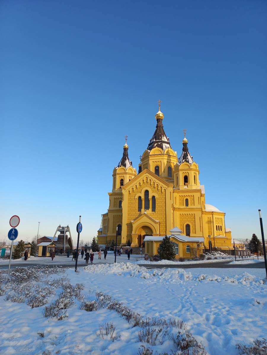 Пятое января было полностью отдано Нижнему Новгороду. Сначала гуляли по городу, тем более, что погода в первой половине дня радовала. Мы даже и не ожидали такого солнышка яркого. Вообще, мы сначала поехали на канатку, но, заболтавшись, проскочили нужную дорогу, и нас вынесло на мост, ведущий к Храму Александра Невского и Стрелке. Туда мы думали заехать после канатки. Но раз уж так получилось, то решили с них и начать. Затем отправились на канатку, но так на нее и не попали. Уж очень очередь на нее стояла большая, а ведь еще нужно было бы отстоять очередь и обратно. Так что решили ее отложить на следующее посещение Нижнего Новгорода, которое, как мы все надеемся, еще когда-нибудь обязательно состоится. Тем более, что погода испортилась, повалил такой снег, что мы мало что увидели бы в любом случае. А пока полюбовались тем, чем удалось, с вершины Чкаловской лестницы и немного прошлись по Кремлю при свете дня. После этого отправились в намеченную заранее Усадьбу Рукавишниковых. Но пришлос