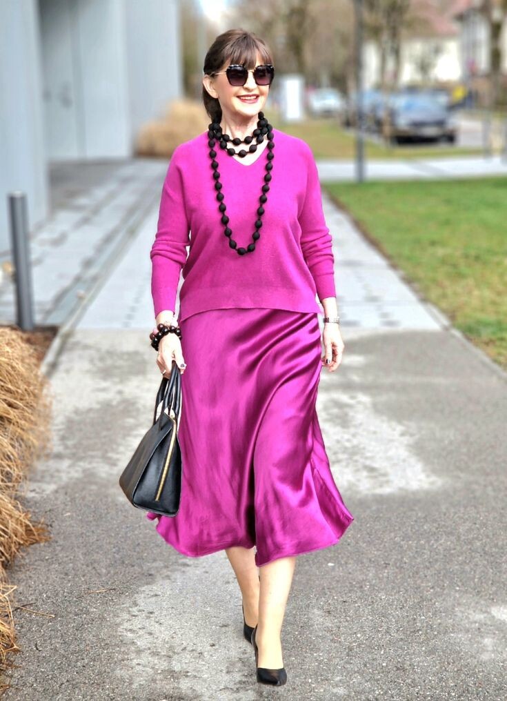 - Костюм цвета фуксия позволит зрелой даме выглядеть роскошно и будний день, и в праздник. Низ: свободно сидящая атласная юбка длиной чуть ниже колен, черные туфли с острым носом на каблуке. Верх: джемпер с неглубоким вырезом. Аксессуары: черные бусы, браслет, кожаная сумка.