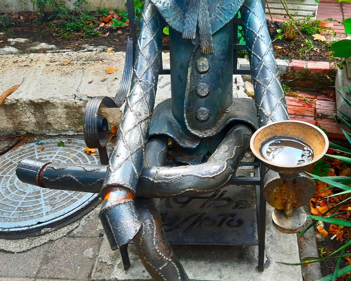 Распространенный ответ: Конь в пальто Действительно, на фотографии, вальяжно развалившись в кресле, восседает не скрывающий своего пристрастия к вину и табаку Конь в стильном пальто. Автор композиции - художник и скульптор Акоп Альбертович Халафян. Шедевр создан в свойственной мэтру манере - из обрезков старых водопроводных труб и металлических пластин.