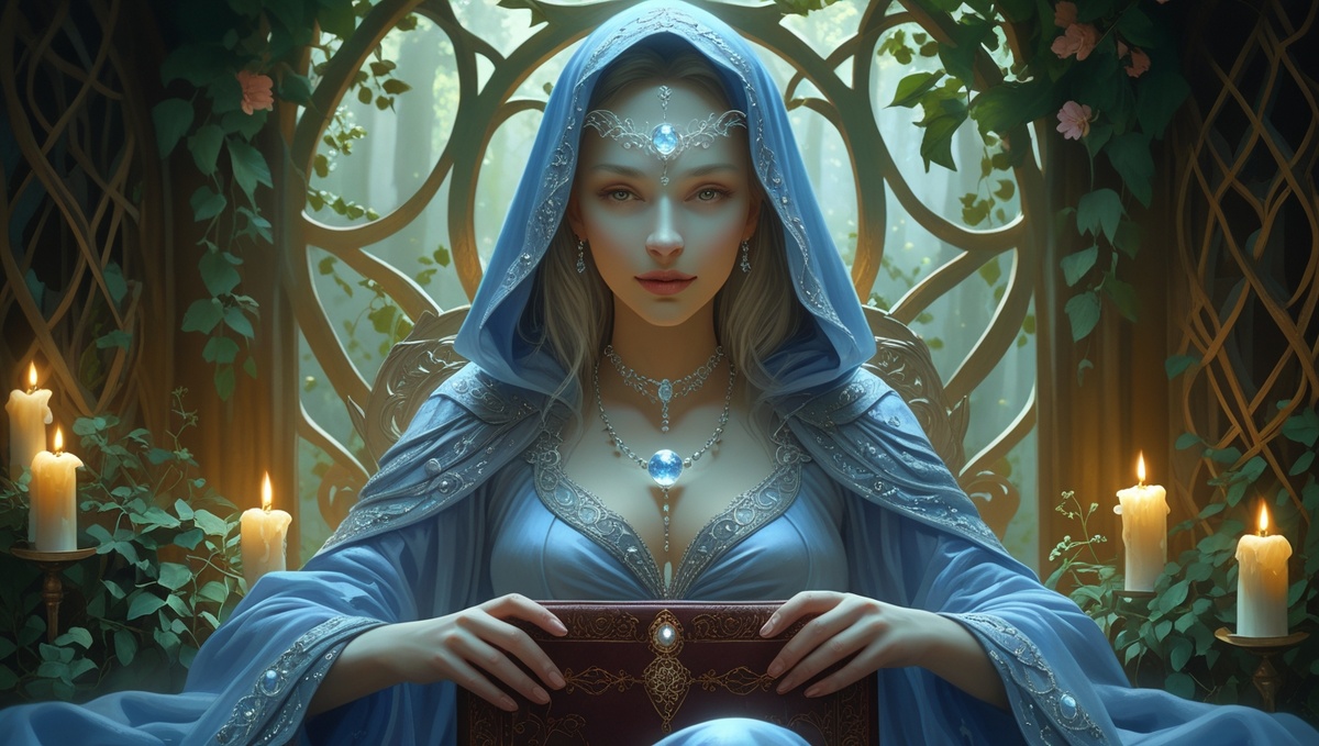- Книга или Свиток: Книга или свиток в руках Верховной Жрицы содержат древние истины и секреты, доступные только тем, кто способен их понять. Это символ мудрости и знания, которые можно получить только через глубокое погружение в себя.
