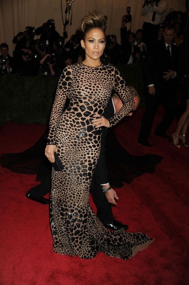- С леопардовым принтом. Лопес – настоящая хищница и покорительница мужских сердец. Поэтому такое платье как нельзя лучше отражает ее характер и индивидуальный стиль. Наряд подчеркивает изгибы фигуры Дженнифер. Актриса не стала использовать большое количество украшений, используя только маленькие серьги.