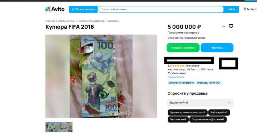 фото: скриншот с сайта авито На популярном сервисе объявлений продают купюру Чемпионата мира по футболу 2018 за 5 млн рублей. Продавец утверждает, что в обороте купюра не была. На ней изоражен ребенок с мячом, а также легендарный советский вратарь Лев Яшин. «Убедительная просьба, не писать всем, кто просто интересуется «А почему такая цена». Пожалуйста не тратьте мое и свое время. Цена указана верно. В будущем будет дороджать», - пишет продавец.