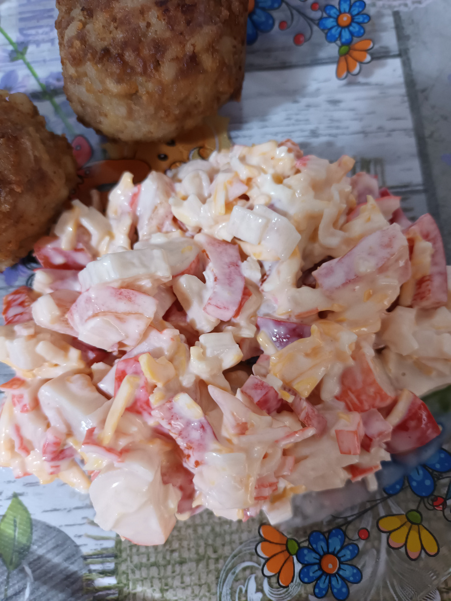 Не было ещё в моей жизни случая, чтобы из поездки, гостей, ресторана или корпаратива я не притащила какой нибудь новый рецепт или идею. В этот раз салат "Красное море", который как выяснилось и не новый уже. Всё о нем знали. Как то мимо меня прошёл. Салат неплохой. Вполне бюджетный. На любителя. Мне понравился, мужу нет. Но уже пару раз делала. Съели. Куда деваться. Мелко нарезать: 200 гр. крабовых палочек 1 помидор Половинка болгарского перца По рецепту был плавленый сырок Я натерла на мелкой тёрке граммов 100 - 150 мраморного. Пару зубчиков чеснока и майонез. Из описания я поняла, что все ингредиенты в равных частях. Может не правильно поняла. Примерно так повторила.