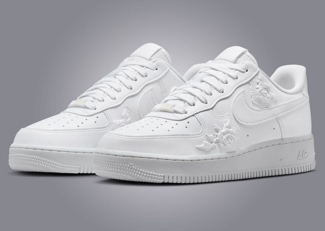 Эта эксклюзивная версия для женщин обладает безупречно белым кожаным верхом, украшенным рельефными узорами роз вдоль бампера, воротника и пятки. Цветочные акценты добавляют тонкое, но роскошное текстурное ощущение в общий дизайн. Знаковые элементы Air Force 1, такие как перфорированная носочная часть и логотип Nike на пятке, остаются неизменными, сохраняя классическую идентичность модели.