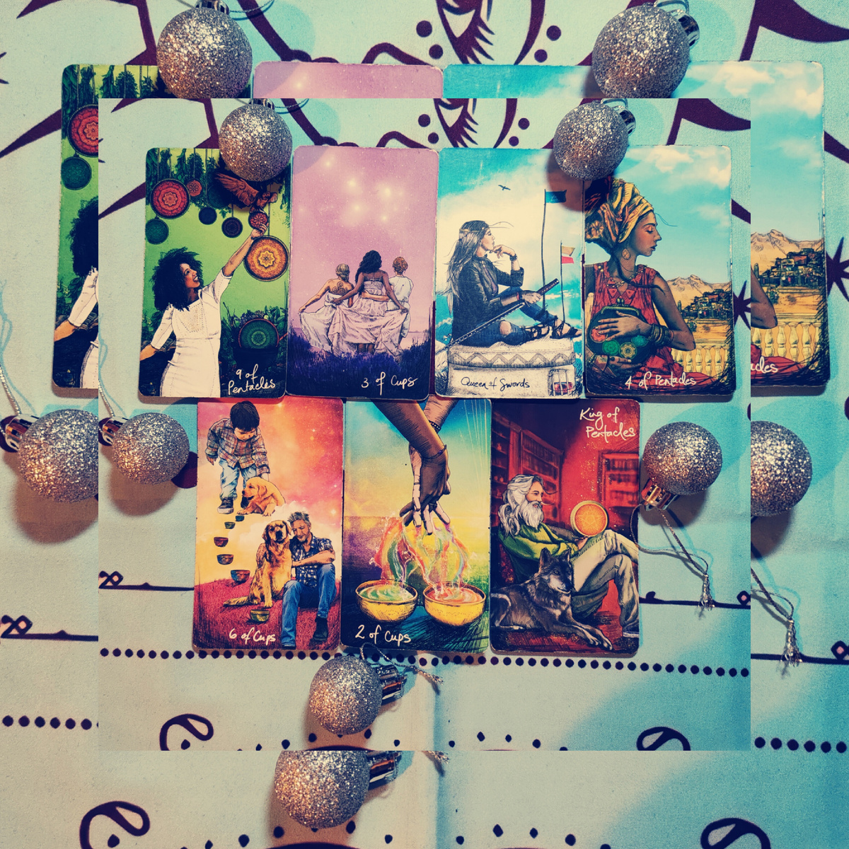 Этот вопрос может подразумевать большое количество дополнительных подвопросов. Обычно так и случается, когда клиент обращается ко мне за раскладом на данную тему. Я собрала эти подвопросы в небольшую схему для расклада. Вот как они звучат. Если тебе подходит эта подборка на любовную тему, тогда сформулируй запрос к колоде и начинай читать расшифровку к раскладу. *запрос может звучат так: Любит ли меня (далее имя мужчины)? 1. 9 пентаклей. Это карта изобилия и большого количества каких-то материальных благ. Если посмотреть на девушку на карте, то можно сказать, что она точно очень сильно счастлива. Это значит, что он видит тебя такой, так думает о тебе. Что ты богата, счастлива, у тебя все хорошо. У тебя есть всё, о чем ты мечтала. 2. 3 кубков. Вообще эта карта говорит о приятных эмоциях и чувствах в отношении тебя. Но ещё она намекает нам на то, что ему не хватает каких-то ваших совместных тусовок, посиделок, разговоров по душам. Просто тёплого дружеского общения. Все эти эмоции он