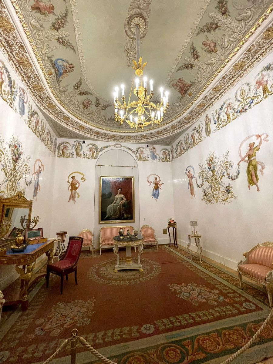 В следующей комнате на стенах картины Робера Гюбера, кресла и стулья из Аничкова дворца, остальное, к сожалению, не запомнила и фото табличек не сделала.