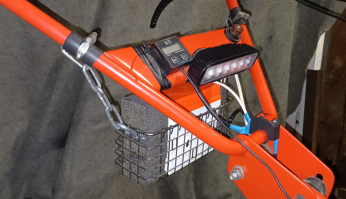 Головной свет на мотоблок АГАТ планировал сделать сразу после покупки. Изначально разместить фару хотел над мотором, для чего думал сделать защитный кожух (подсмотрел у одного из мотоблочников). Однако, в процессе обкатки мотоблока понял, что такой кожух слишком сложен в изготовлении и отказался от этой идеи. Фару решил установить на перекладине рукояти управления, т.к. она разворачивается на 180 градусов, когда мотоблок используется с отвалом, например. Соответственно, фару, не нужно будет разворачивать. Источником будет служить АКБ для снегоходов и "квадриков" на 9 а/ч. АКБ разместил в качающейся подвеске (из металлической полочки для ванной), чтобы он оставался в вертикальном положении при наклонах корпуса. Цепи на рукояти закрепил хомутами, проложив под них подкладки из ПНД-25. Чтобы внутри сетки АКБ не смещался влево-вправо сделал два уплотнителя из вспенненого полиуретана. Из него-же сделал защитный колпак на плюсовую клемму. Кнопку включения-выключения света разместил в нижней ч