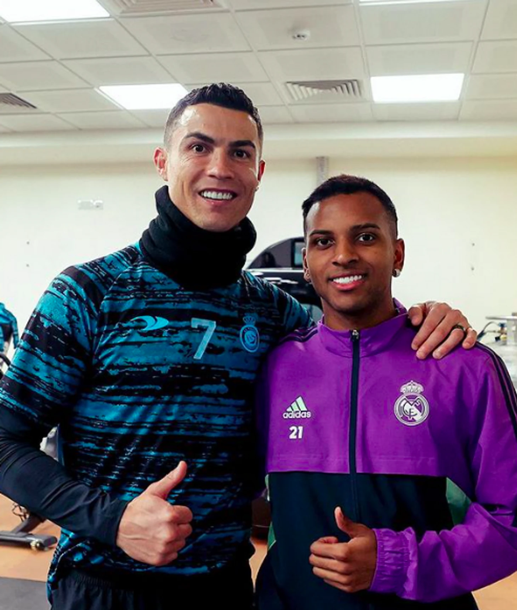На днях «Мадрид» отправился в Саудовскую Аравию, где команде в рамках Суперкубка Испании предстоит сыграть как минимум один матч против «Мальорке». В случае победы клуб выйдет в финал на пару «Барселона» / «Атлетик». Несколько лет назад этот же турнир проводили на том же месте − в Эр-Рияде. Тогда в гости к своей бывшей команде приехал форвард «Аль-Насра» Криштиану Роналду и ему организовали встречу с игроками «Мадрида». Больше остальных нервничал вингер «сливочных» Родриго, ведь португалец был его кумиром. Они не успели пересечься в столице Испании, так как бразилец пришел в команду в 2019-м, а португалец ушел на год раньше. Клубные соцсети тогда показали, как тряслись у него руки при виде Криштиану. Спустя два года видео снова завирусилось в интернете. После Родриго получил заветное фото на память. Возможно, что в 2025-м они встретятся снова.