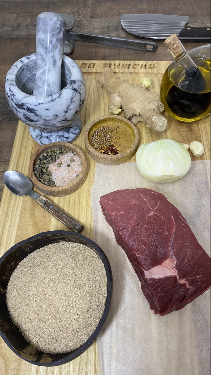 Этот замечательный рецепт превратит ваш обыденный ужин в настоящий гастрономический опыт. Имбирный маринад придаст говядине невероятную сочность и неповторимый вкус. Можете приготовить отбивные в имбирном маринаде на мангале и порадовать себя и своих близких незабываемым ужином. Этот кулинарный шедевр отличается легкостью в приготовлении и способен удивить даже искушенных гурманов. В центре вкуса этого блюда - мягкое говяжье мясо, которое обретает неповторимые вкусовые качества благодаря пикантному маринаду. На приготовление блюда потребуются вышеперечисленные ингредиенты и около 50 минут вашего времени. Мясо разрезать на пласты толщиной 1 см и отбить с двух сторон кухонным молотком, лучше это делать через пищевую плёнку, так не будет брызг, а если смазывать растительным маслом, то мясо не будет рваться. Сложить все пласты в глубокую миску. Для приготовления маринада в чашу блендера положить порезанный на четыре части лук, чеснок и очищенный имбирь, влить соевый соус. Всё это взбить